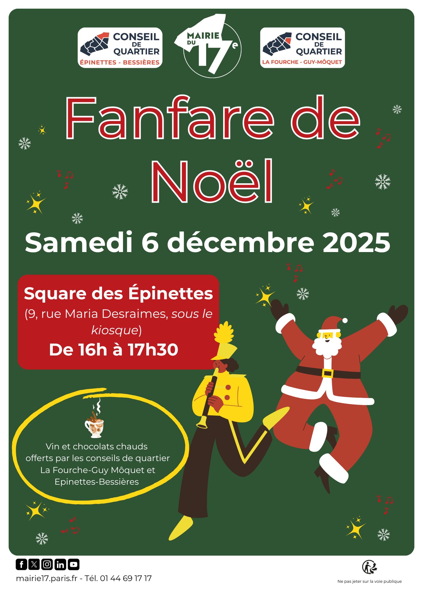 Samedi 6 décembre 2025, venez écouter une fanfare de Noël autour d'un chocolat ou vin chaud, de 16h à 17h30, sous le kiosque du square des Épinettes (9, rue Maria Desraimes).