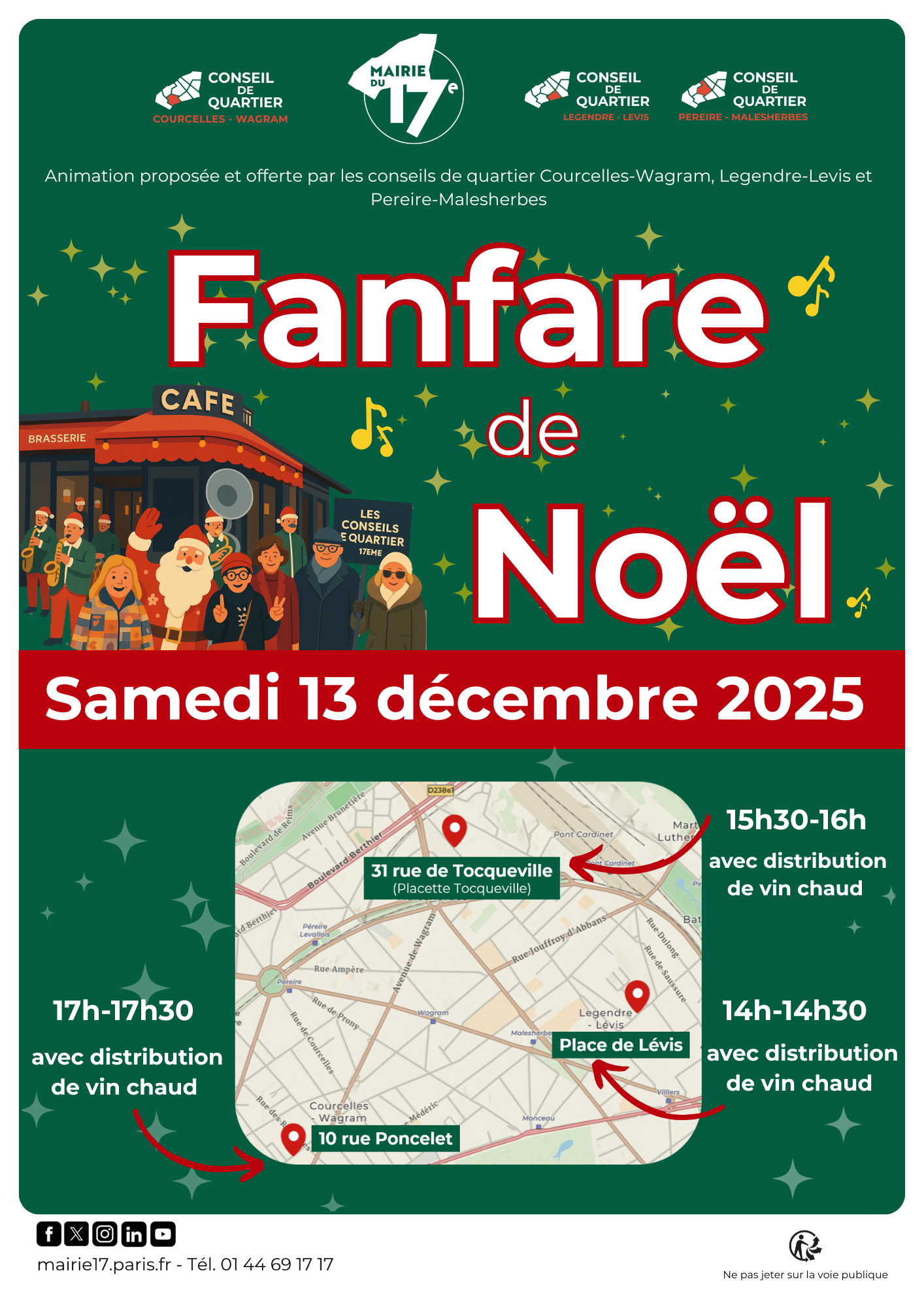 Samedi 13 décembre 2025, venez écouter une fanfare de Noël autour d'un vin chaud, de 14h à 14h sur la place de Lévis.