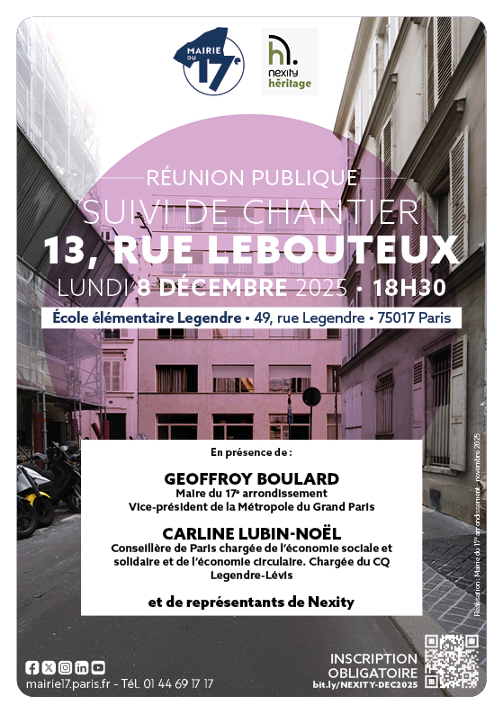 La prochaine réunion publique du conseil de quartier Legendre-Levis aura lieu le lundi 8 décembre à 18h30 | École élémentaire Legendre (49, rue Legendre)