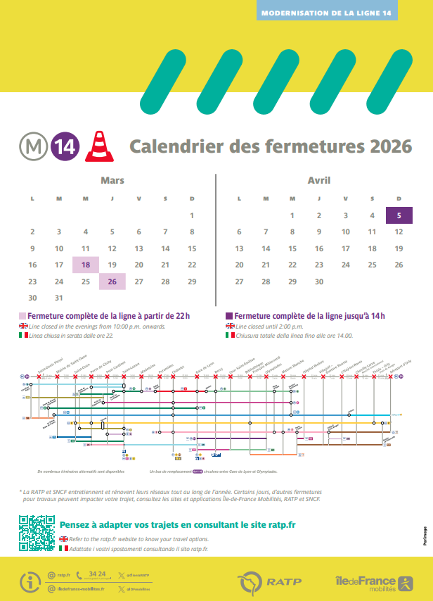 Afin de permettre la finalisation des travaux de modernisation, la ligne 14 du Métro fera l’objet de plusieurs Interruptions Temporaires de Circulation (ITC) en 2025. En effet, pour des raisons techniques et de sécurité, certains tests devront être réalisés en conditions réelles et en dehors des circulations avec voyageurs, et imposent des interruptions en soirées, certains weekends et plus longuement en août 2025.