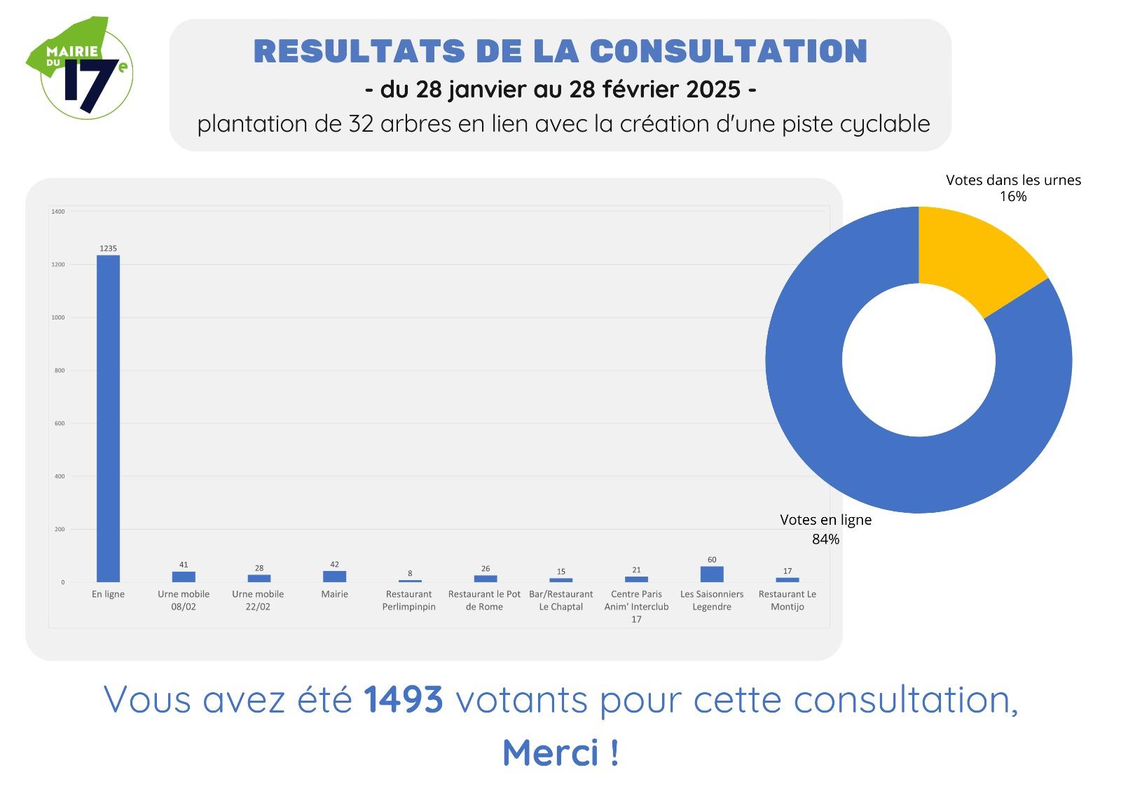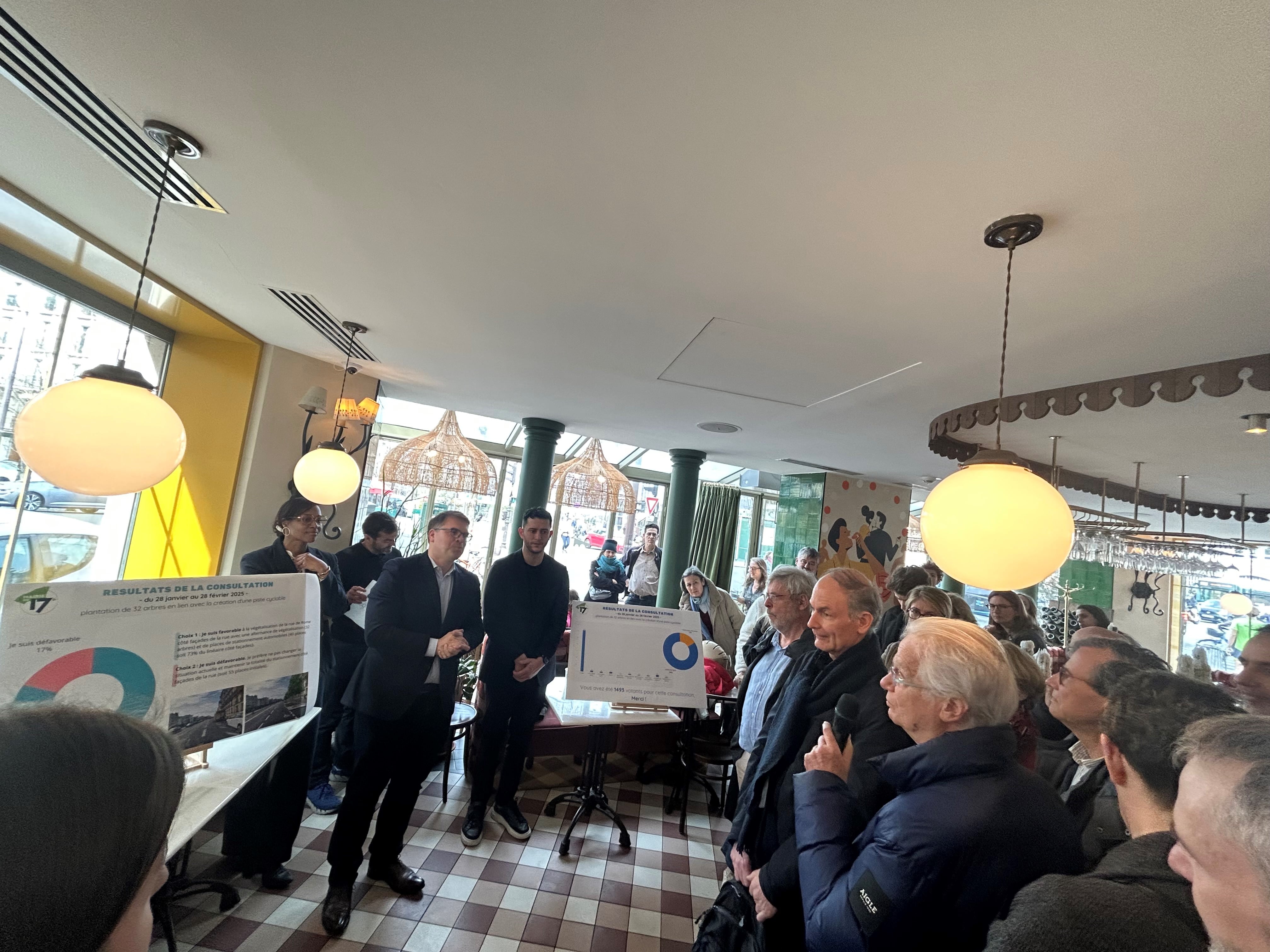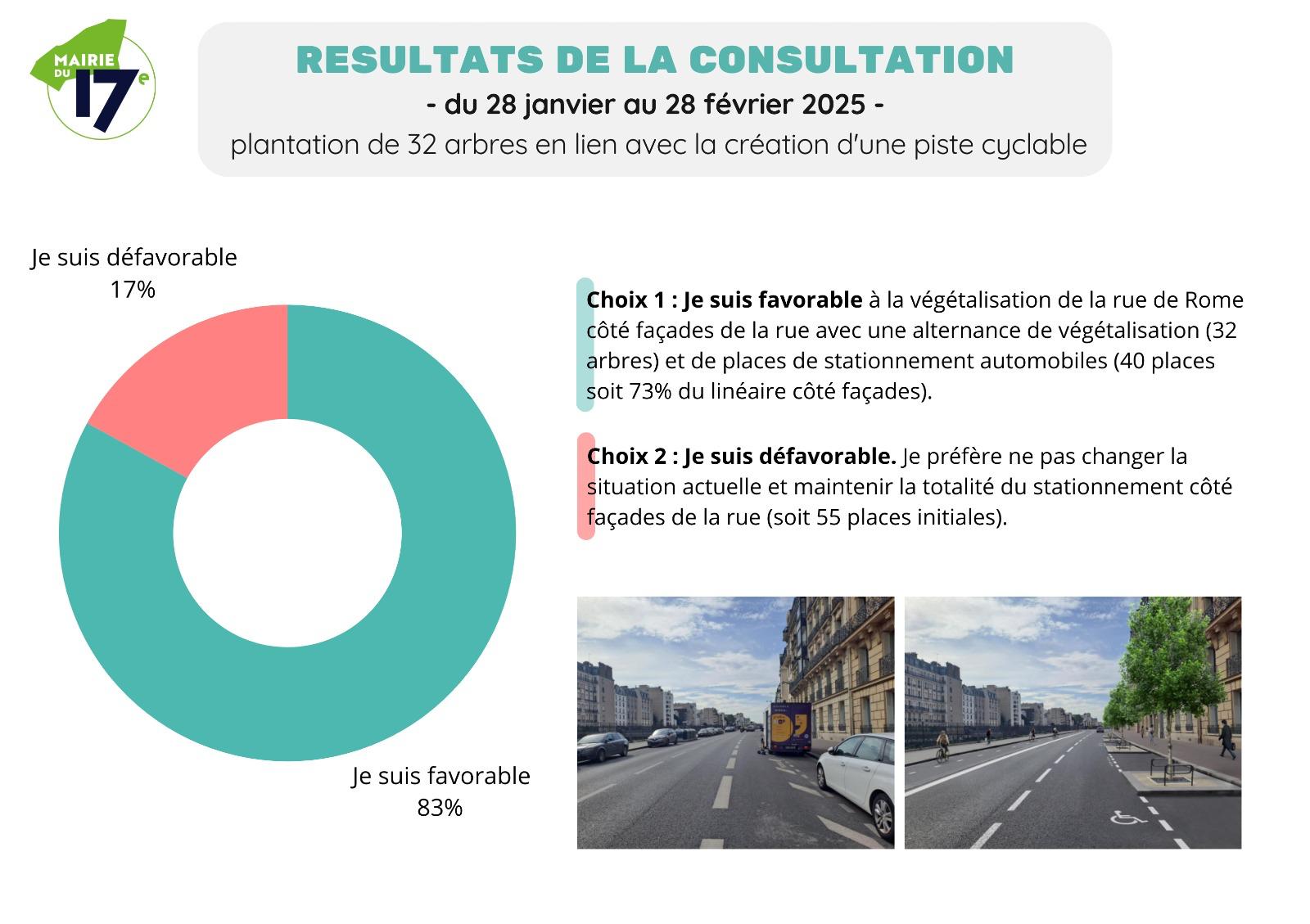 Du 28 janvier au 28 février 2025, Geoffroy Boulard, Maire du 17e arrondissement et les élus du 17e arrondissement ont consulté les habitants et usagers de la rue de Rome sur la plantation de 32 arbres, liée à la création d'une piste cyclable.